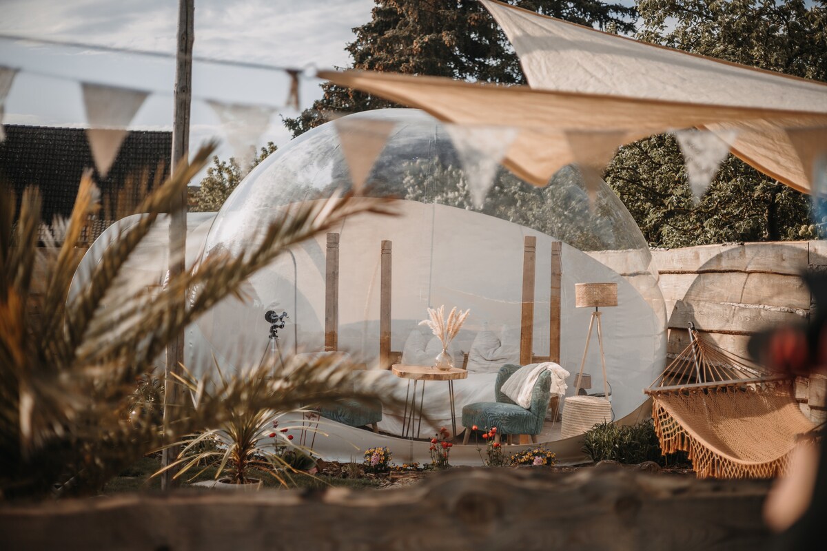 Come out into nature - sleep under the starry sky at the gates of Berlin. Experience an extraordinary overnight stay in the bubble house in the Alpacosi oasis. The oasis overlooking the endless fields is all yours. Surrounded by flowers and plants, a high-quality trailer with kitchen and bathroom is available next to the bubble house. Everything has been prepared by us, with a lot of attention to detail, for you.