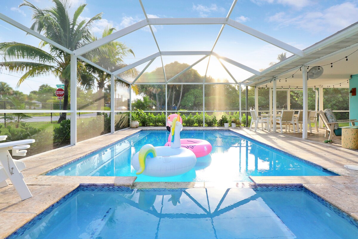 Welcome to The Palm — a fire pit oasis near Jensen Beach. Unwind in the private backyard, relax in the screened patio with smart TV and hanging chairs, or cook in the fully stocked modern kitchen. Just minutes from Jensen Beach, Stuart Beach, and historic downtown Stuart, this home is perfect for families, couples, and remote workers. Enjoy fast Wi-Fi, memory-foam beds, and kid-friendly extras like a pack & play and changing station.