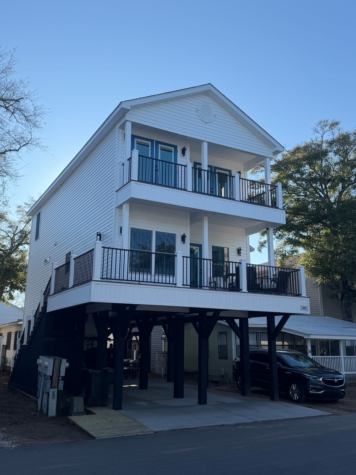 This stylish 3-bedroom, 2-bathroom stilt house in Ocean Lakes is the ideal getaway for those seeking contemporary comfort and coastal charm. Situated on a premium-size lot, in Ocean Lakes Resort. It has a side lawn area, an outdoor bar/TV area and is Elevated for plenty of entertaining and parking space. Inside there are 4 beds, sleeping up to 7 people (up to 6 adults). Complimentary use of golf cart for licensed drivers age 21 and up.