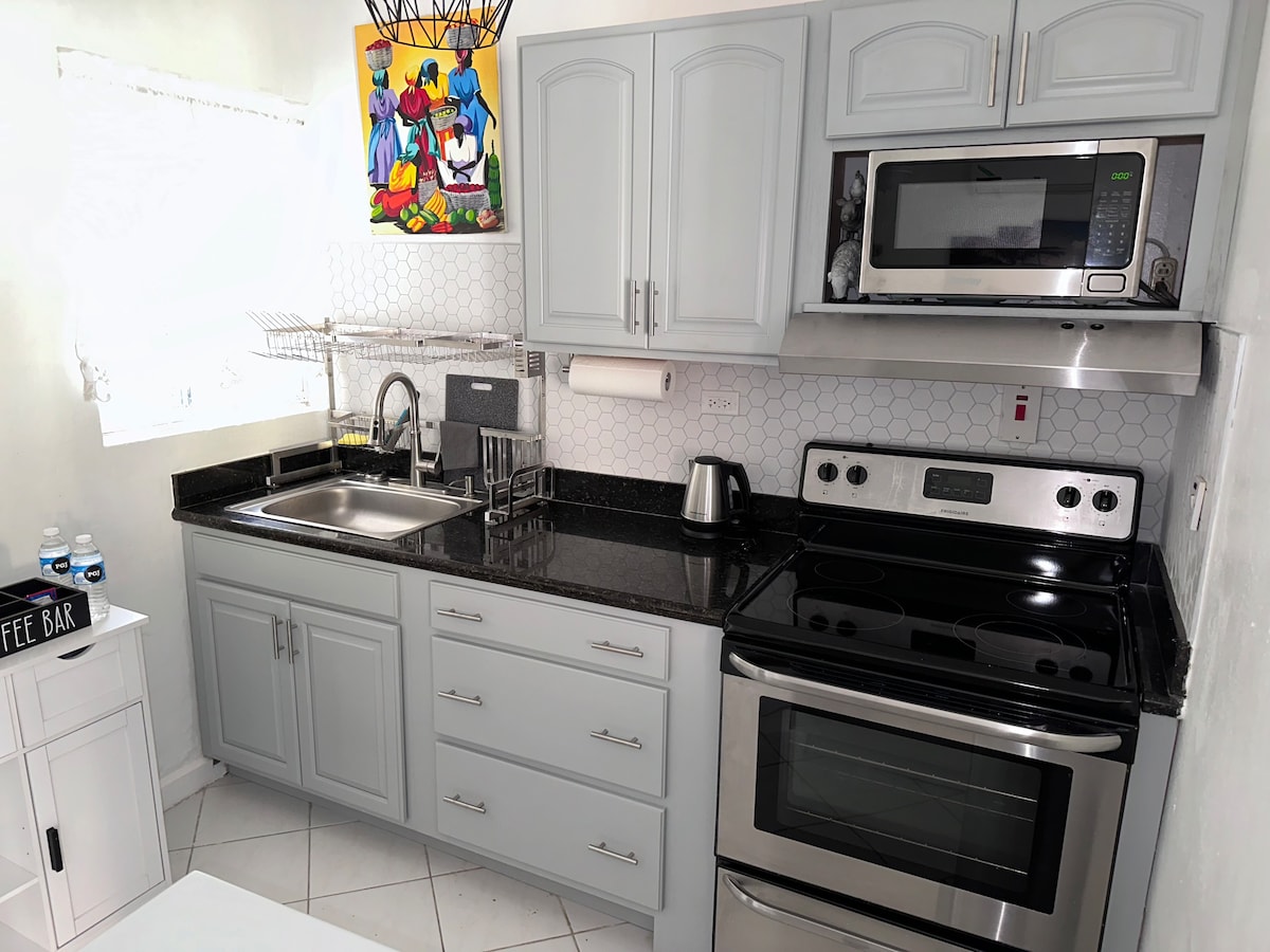 This recently upgraded studio apartment boasts a modern appeal and is infused with various tech for a smart home experience. It is centrally located, directly overlooks the popular Ocho Rios Bay Beach and provides the perfect getaway for those desirous of a tropical escape. It has a fully equipped kitchen, with king and single sized beds. Have your morning coffee on the private balcony or a drink of wine with your loved one while watching the sunset or the waves crashing on the beach.