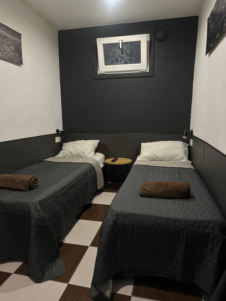 Chambre double pour deux personnes n° 2. Cette chambre est située dans l'auberge Le Rêve, en plein centre d'Odessa. Elle dispose de deux lits simples, d'une télévision et de tables de chevet.