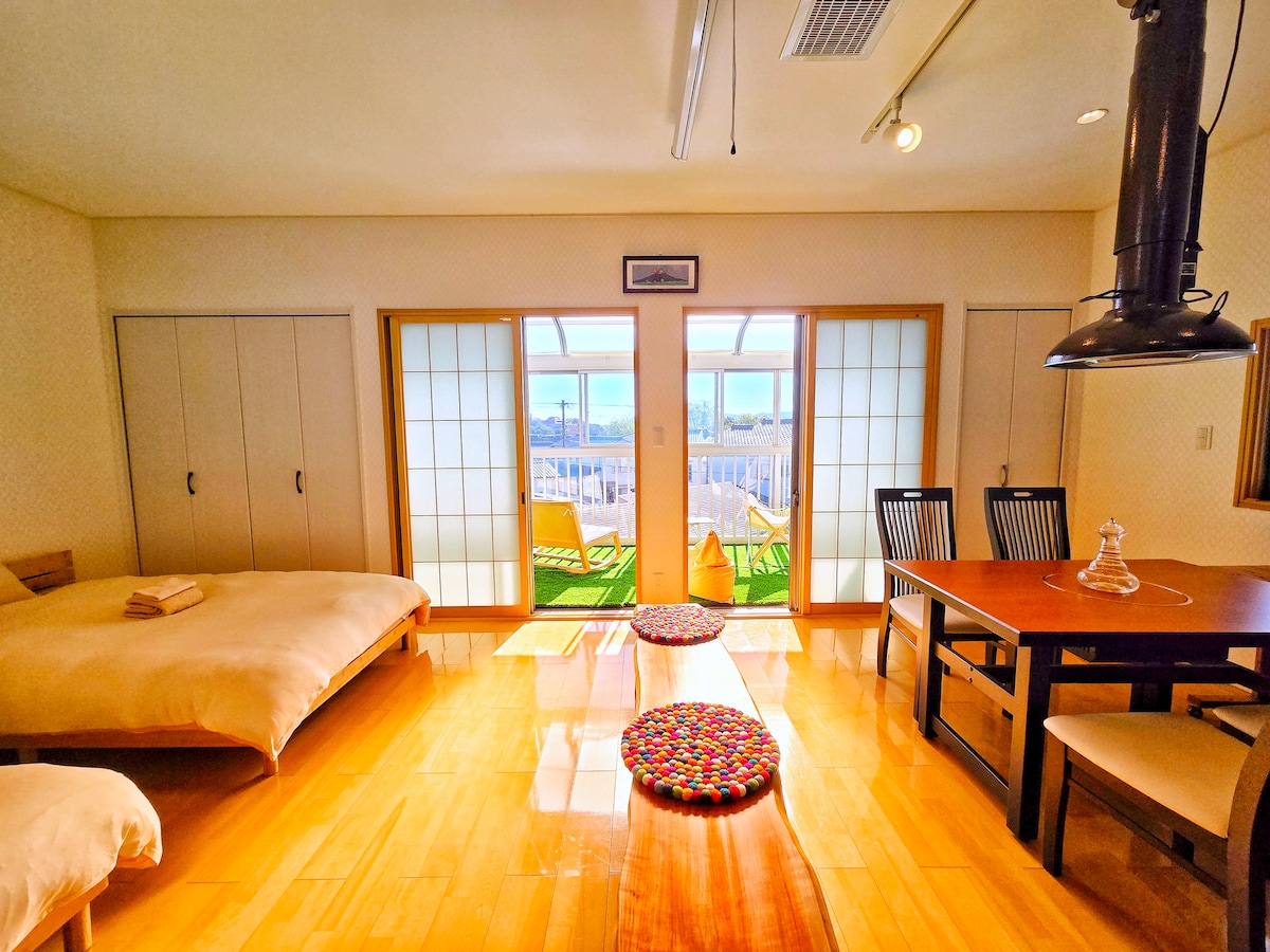 ♨️PRIVATE ONSEN* Besides the indoor bath, you can enjoy a free private natural hot spring on the first floor. 💎JAPANESE-MODERN SPACE Experience a unique blend of Japanese tradition and modern design, with a tatami bedroom and artwork by local artists enhancing every detail. 🍖ROOFTOP BBQ Enjoy a rooftop BBQ surrounded by the sea and mountains while feeling the refreshing breeze. A perfect way to spend your evening with family and friends under the open sky. This is a paid service.