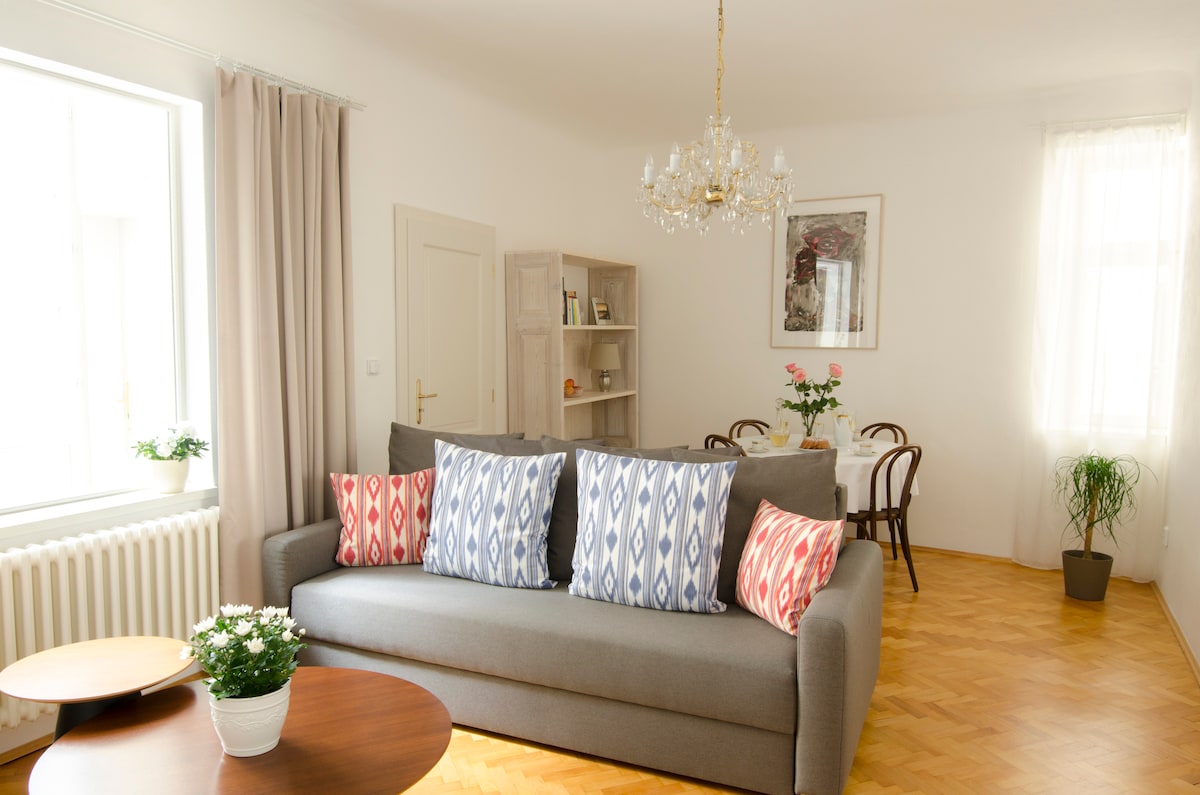 ★ Historic House ★ Original Furniture and Art ★ Kitchen ★ High-speedWiFi ★ Experience the original atmosphere of a baroque building in Prague downtown. The apartment with furniture from the 'fin de siècle'' epoch has a large bathroom, cloakroom and conservatory. Big enough for four guests, modern, equipped kitchenette, king size bed and convertible sofa. Washer/dryer, Wi-Fi, Netflix TV provided. Hope that original art and Persian rugs from family collection will make your stay pleasant.