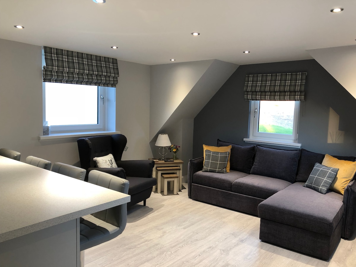 Experience the peace and tranquility of country living. This modern, unique one bedroom, two floor apartment forms a wing of a 150 year old converted steading. The ground floor features two private entrances, a downstairs shower room and spacious open plan kitchen-lounge. 50 inch smart tv and fully equipped kitchen. Upstairs features a large bedroom with independent storage room, decadent freestanding bath, King- sized bed with new mattress and storage drawers.