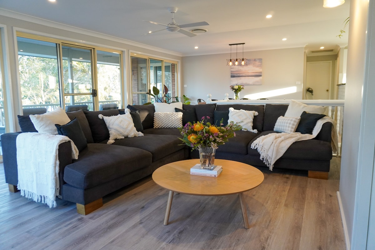 Fifty Five on Sunrise Beach at Soldiers Point On the shores of Nelson Bay only 2.5hr drive from Sydney and only 30mins to Newcastle Airport makes for an easy short stay unless you're lucky enough to linger longer Enjoy sunrises as you wake with a coffee or yoga on the deck as the sun rises on your doorstep Once you've arrived at Fifty Five there’s really no need to leave! PLEASE NOTE We require all adult guests to be Airbnb verified prior to checkin please