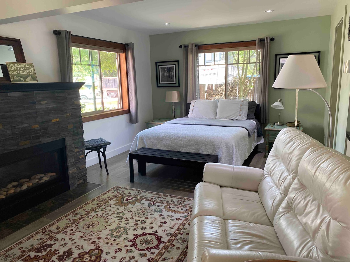 Quiet, comfortable large studio with dream bed, cozy gas fireplace and a spacious beautiful kitchen. Private covered entrance and lots of storage for golf clubs, bikes and skis/boards. In suite washer/dryer. Conveniently located 3 blocks from downtown shopping and restaurants. Quick access to all outdoor activities. In the winter a free shuttle to Red Mountain stops in front of house. In town for work or longer stay? Inquire for excellent mid-term rates. 4962.