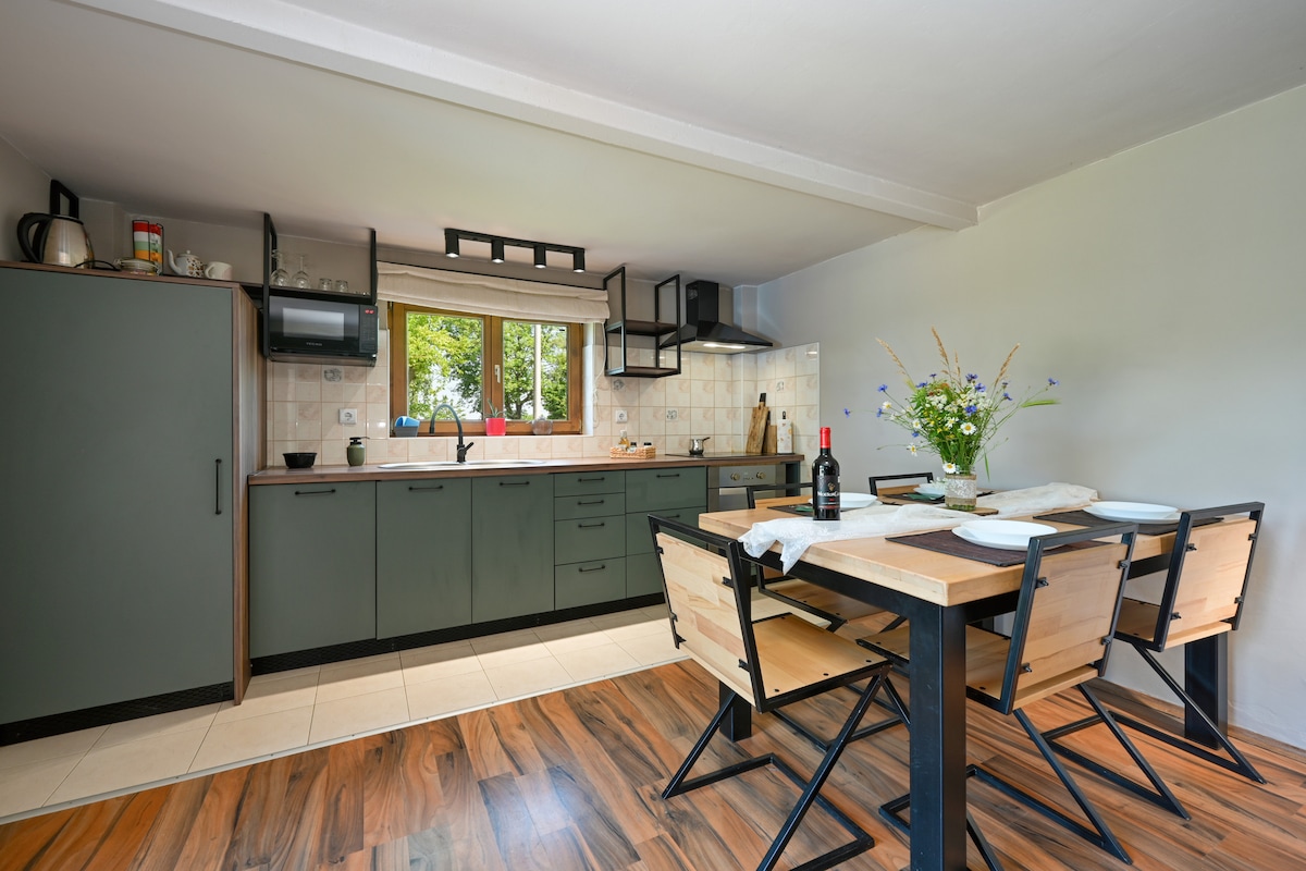Spacious 42 m² ground-floor apartment ideal for up to 4 guests. It includes one bedroom with a double bed, a living room with a pull-out sofa (160 × 200 cm), a fully equipped kitchen and dining area, and a private bathroom. Private entrance, free parking, Wi-Fi, and access to a large shared terrace (100 m²). Perfect for families or couples seeking comfort in a quiet rural setting.