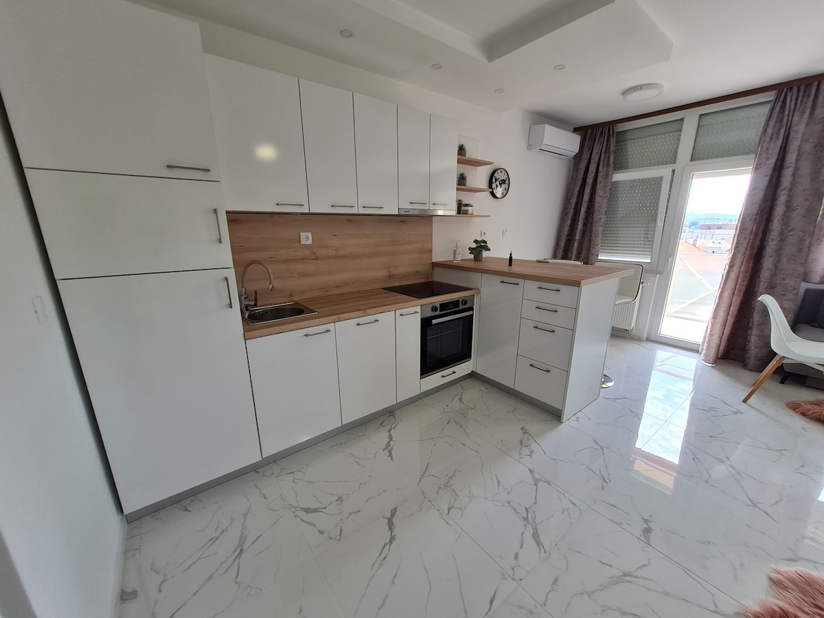 Discover our luxurious apartment in the center of Virovitica! Comfortable king-size beds, a sofa bed for two, stylish large-screen TVs with Netflix in each room. Fully equipped kitchen, walk-in shower, secure entrance, spacious balcony with views of the Pejačević Castle and city park. Accommodates up to 6 people. Settle in comfortably in our apartment. Book today for the perfect getaway!