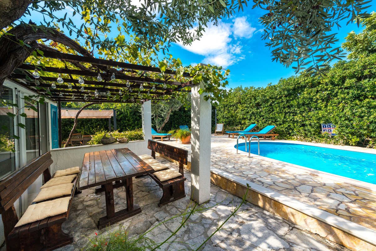 HOLIDAY HOUSE WITH A PRIVATE SWIMMING POOL! 5 min walk from the beach, and with free parking Two floors, a big garden with bbq, pool, sun beds, big dining table, wooden house for kids. Driving distance (car, Uber, bus) to Dubrovnik & Cavtat 15 min, Airport 20 min This rural holiday home is perfect for a family or a group of friends. Located in a quiet area a few minutes walk from beaches, supermarkets, cafes and restaurants, bus/boat station, and easily accessible by car (free parking).
