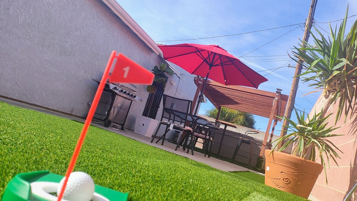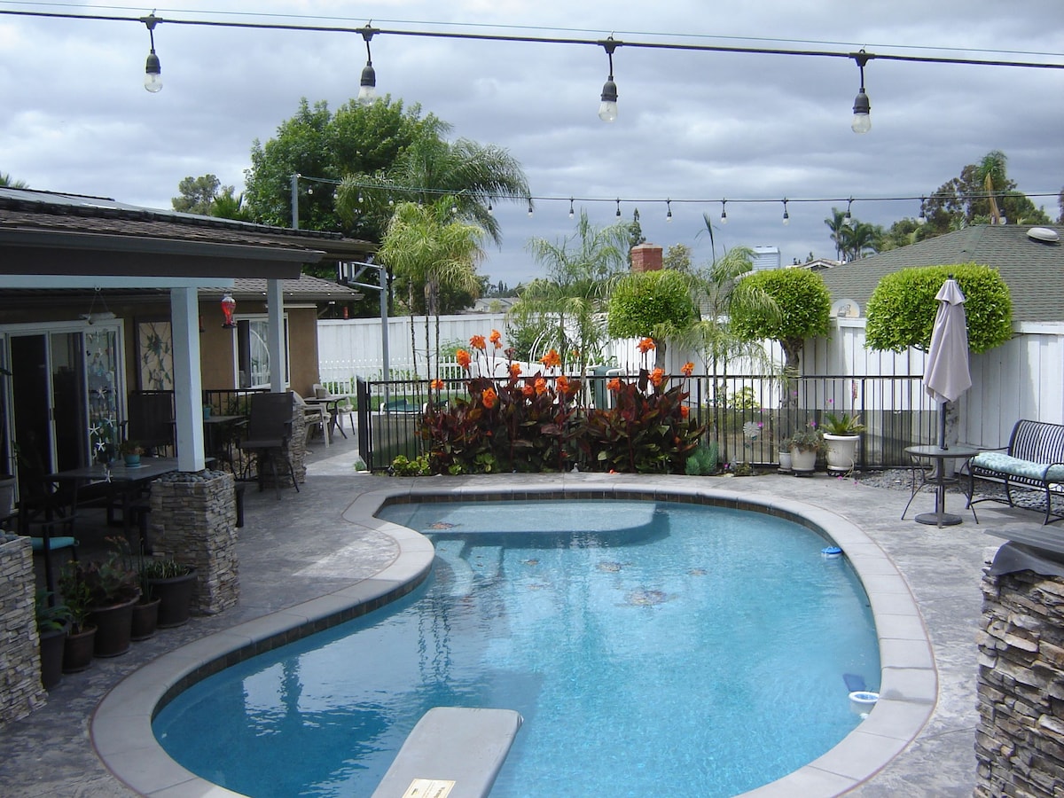 Art-filled retreat with unique artifacts, a lush garden with vibrant plants and vegetation, small pond, private pool & spa, firepit, and outdoor kitchen. Relax in a quiet cul-de-sac with two shaded patios, modern entertainment including streaming TVs, surround sound, a small pool table, and an Xbox. Ideal for families, friends, couples, or business travelers seeking comfort, privacy, and a memorable Southern California stay near Disneyland and major attractions.