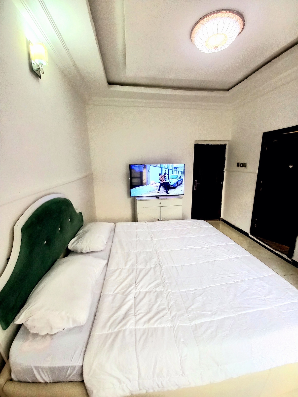 This cozy apartment features one bedroom with classy wardrobe and fans Sitting room with television air condition fans and work place Modern equipped kitchen with gas stove fridge freezer toaster kitchen utensils and microwave Bath room with shower situated in a gated community and built in a gated spacious compound with free parking and renowned security Provision for three exterior cameras supported with flood light .Solar powered 24 hours coolness backed up with 40 KVA generator.