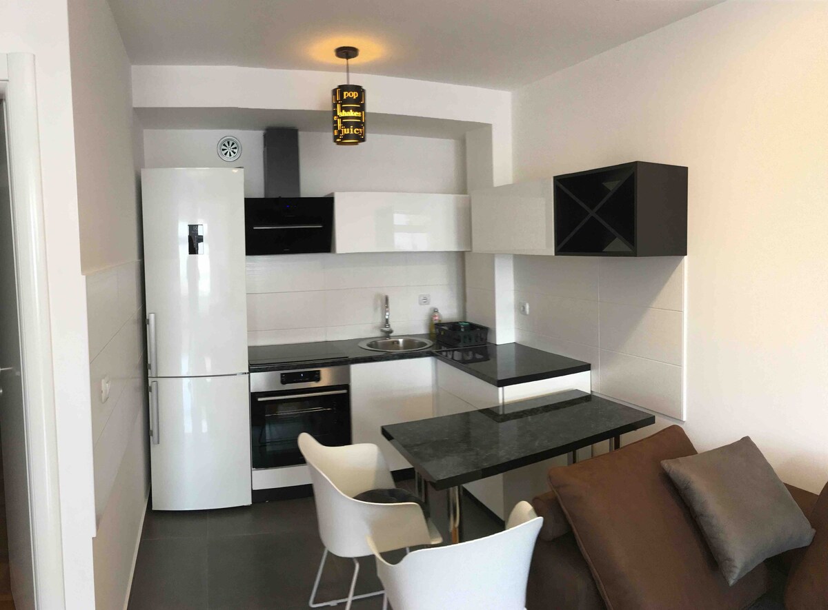 Mint&White Studio: A peaceful oasis in Borik. A blend of modern design and home feeling, within easy reach of the centre. Ideal for couples and business guests. We offer you: ✨ Comfort: Hotel white linens and impeccable cleanliness. 🚗 Garage: Free parking at the property. 🏋️ Fitness: Gym in the building itself. 📶 Work: Fast WiFi and a rich TV video library. 📍 Location: 5 min to Vrbas, 10 min to Delta, 15 min to the center. Extra: We arrange airport pickup. Welcome!