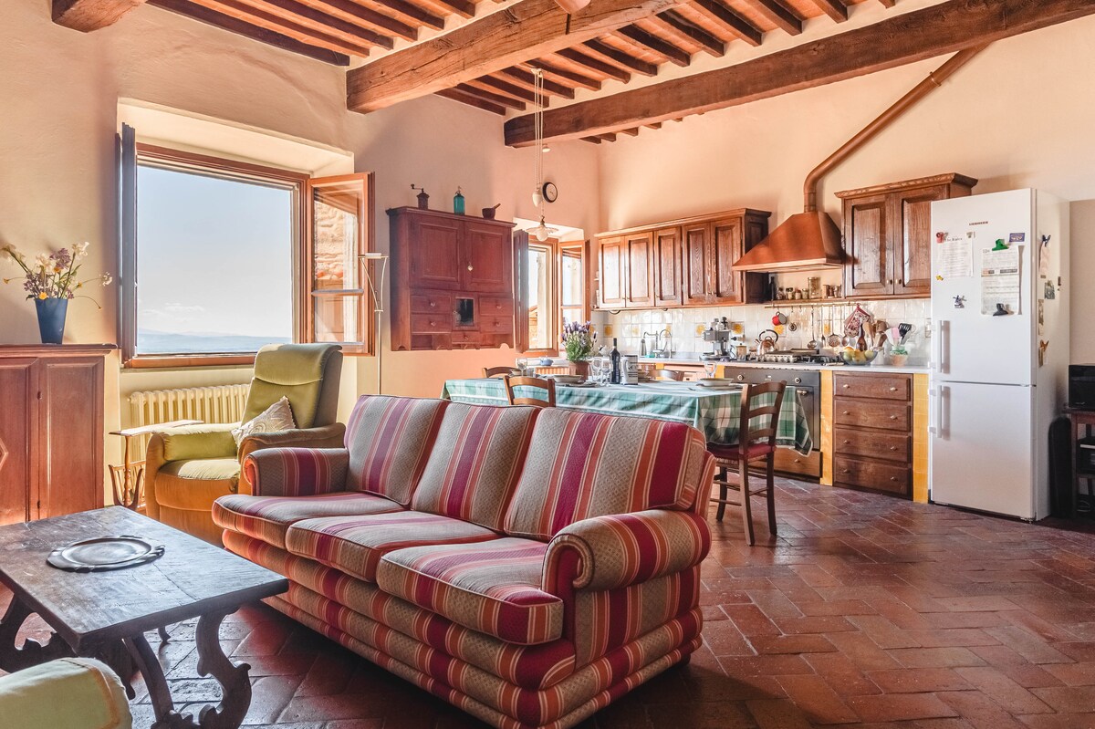 Huge and charming top floor apt in Tuscan Villa with breathtaking view! Visit Montepulciano, Pienza, Siena, explore country side, vineyards and hot springs, hiking or e-biking, strolling or driving! Two roomy suites with top quality beds and bathroom ensuite. Windows walled living room, comfy sofas, professional kitchen at your own use. We can set Winery visit & tasting, Cooking classes and private dinners. NEW Hot tub facing green hilltop! ExperienceTuscany as a local, with your local Host!