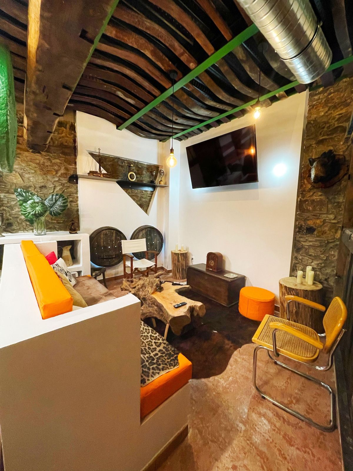 La Panera is a spacious upper-floor suite for up to 4 guests (2 adults + 2 children), with three large windows offering spectacular views of the valley and northern mountains. Features a king-size canopy bed (or two singles), an integrated shower with panoramic views, and a cozy sitting area with sofa, armchairs, TV, and tea/coffee space. Surrounded by natural stone and wood ceilings, it’s a warm and romantic retreat. WiFi included. Pets not allowed.