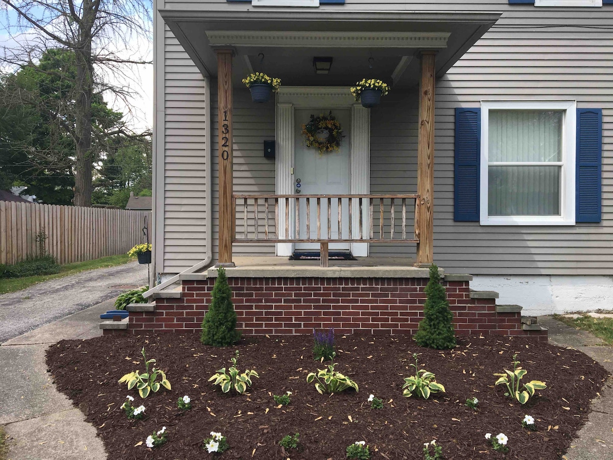 The Boho Bungalow is an updated 1920's bungalow with plenty of traditional charm. Wood floors, built ins and vintage kitchen make it cozy and welcoming. It's perfect for traveling professionals or families needing short term housing while visiting the Elkhart/South Bend area. The home is just blocks from Elkhart General Hospital and is very convenient to downtown Elkhart, Granger and South Bend. It's less than 15 miles from Notre Dame.