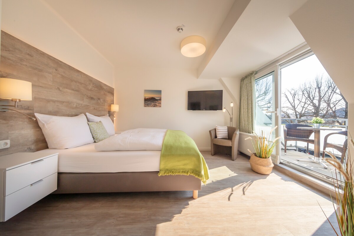 This room is about 28 square meters and can accommodate up to 2 guests. It is located directly on the beach and promenade. The modern apartment is equipped as follows: 1 living room/bedroom, 1 tasteful shower room (hair dryer is available), TV (flat screen), with balcony and side sea and harbor view.