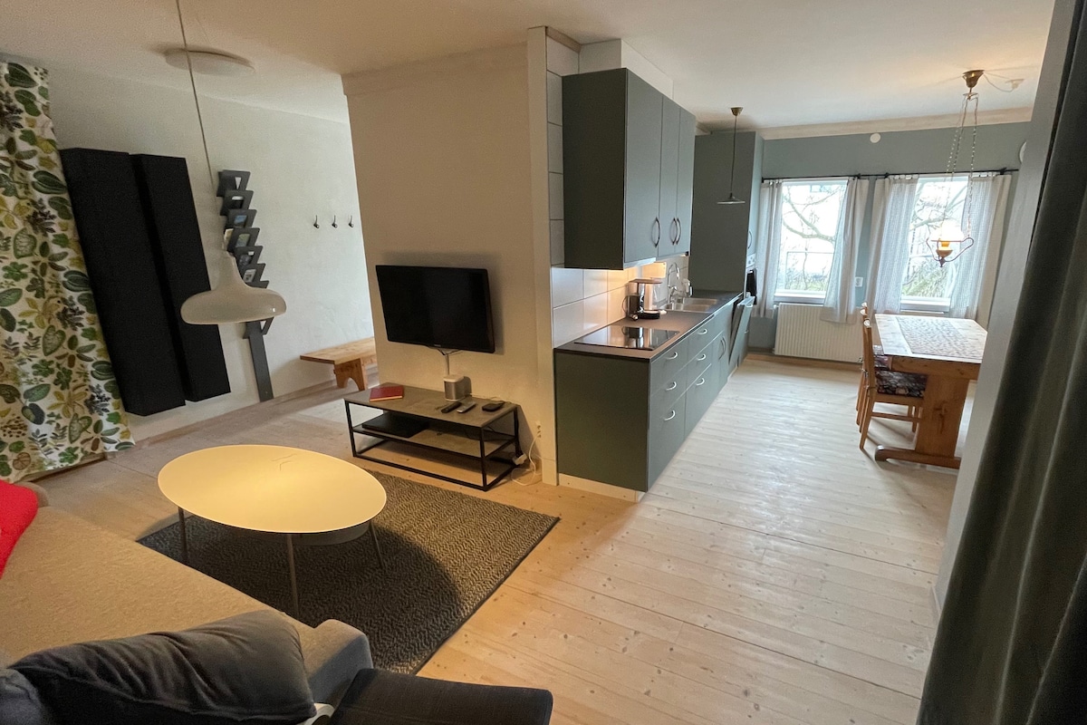 Cozy apartment in a courtyard house in Södra Mellby, Österlen. There is a private patio, a living room with kitchenette and sleeping loft with room for three people. The entire old Skåne farmhouse has been newly renovated in the past year and the guest house is part of the farmhouse, which also houses an artist's studio and gallery. The guest house has a separate entrance. Of course, the cottage is also decorated with art from the studio.