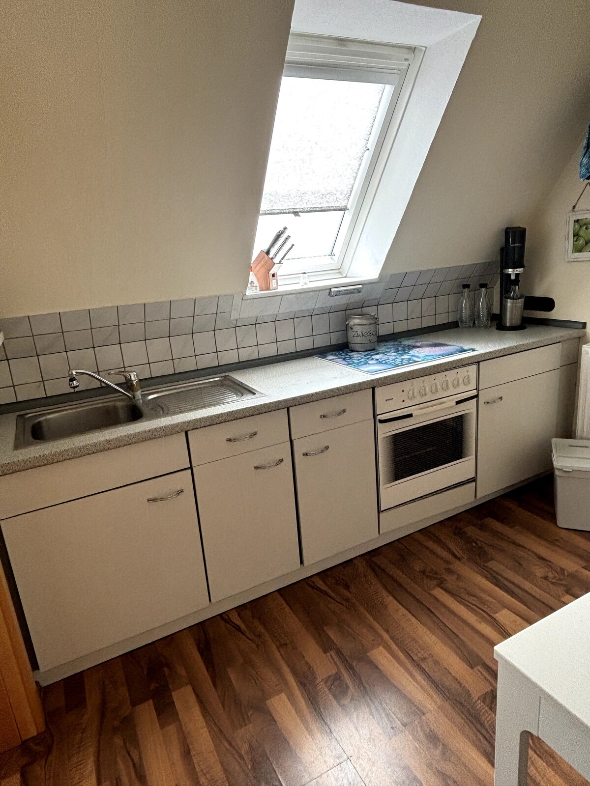 The modern 40 sqm apartment is located on the 2nd floor of the newly built extension of our residential building and has a light-flooded living room with a comfortable couch and flat-screen TV, as well as a double bed. The kitchenette with dining table is equipped with an oven, ceramic stovetop, fridge, dishwasher, coffee maker, kettle and toaster.