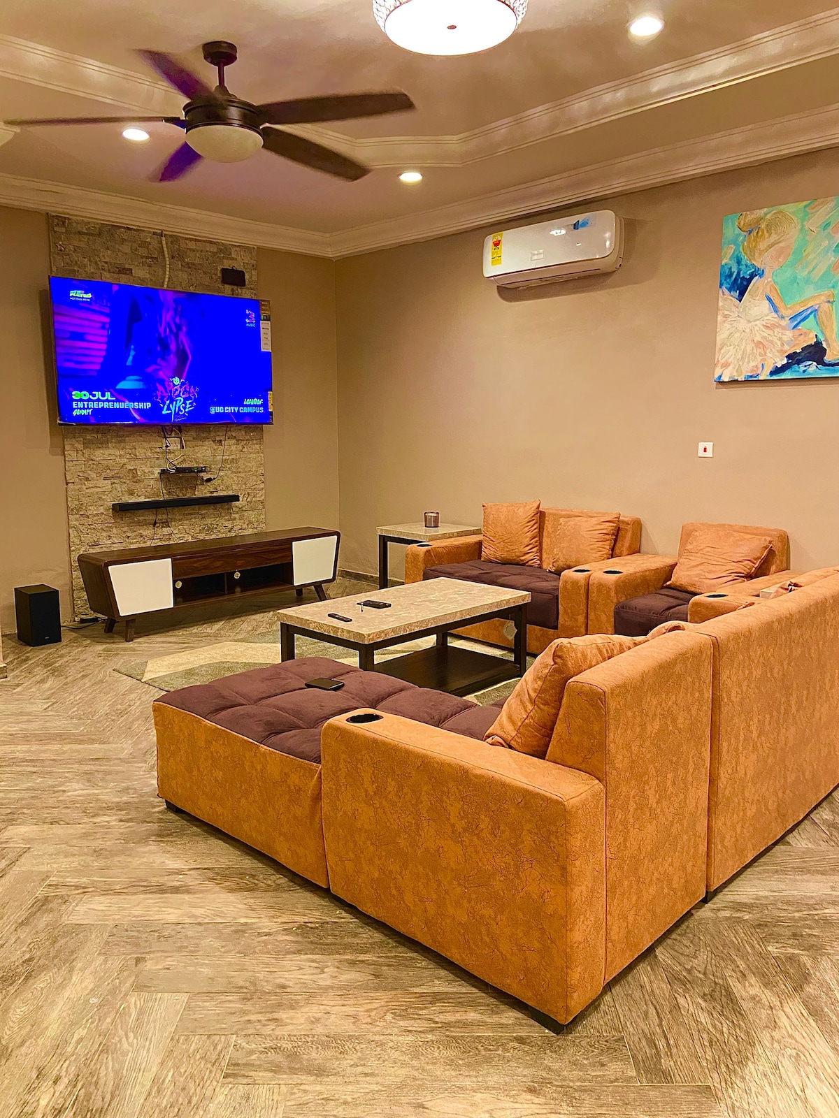Grand suit is a 3bedroom in a gated community with 24hr security guards, CCTV surveillance and barb wire. Grand Vista is fitted with modern home appliances, Kitchen appliances amenities that make life comfortable. The living area is fitted with 80" TV set, aesthetically appealing but comfortable Sofa, well laid out dinning and bar area. The back yard offers outdoor furniture for family relaxation and dining. Tha balcony is fitted with Automatic retractable awning, fully LED.
