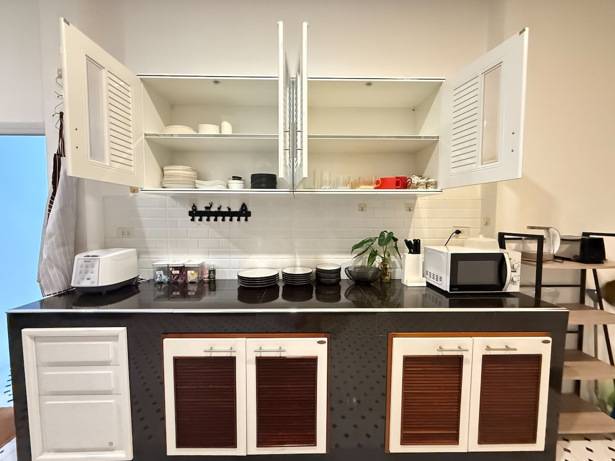 Max 3 adults or 2 adults & 2 kids is on 3rd floor with great view, 1 queen size bed, 1 sleeping sofa (for kids or to relax), 1 desk, TV, fridge & shower. Shared Gym, Rooftop, Garden & kitchenette on the same compound. Free to use. The compound is adjacent to a beautiful small stream & directly next to the Saturday market park with huge playground. Surrounded also by many cafe's, restaurants, Yoga Centers & co-workings. The night market at the famous walking street is only a 10 minute walk.