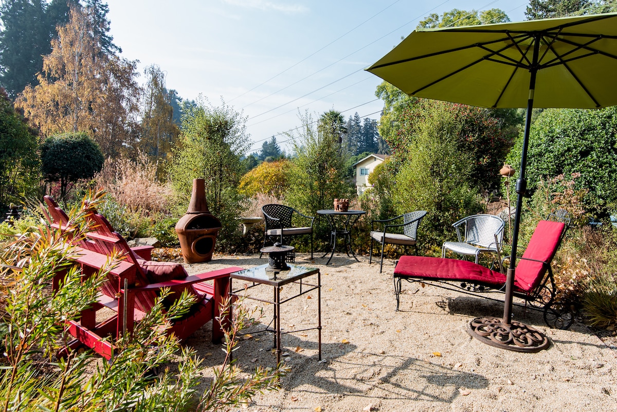 As an artist, I'm deeply interested in aesthetics. I think I've succeeded in creating a beautiful, restful venue for relaxation. The queen size bed overlooks a bird sanctuary over the Valencia Creek watershed. The kitchen includes a fridge stocked with goodies, toaster oven, microwave, coffee pot, French press and cooktop for light cooking. You're welcome to use the oven/stove in the main kitchen with prior arrangements. A backyard gas barbecue is available for heavier cooking (or if you're planning to cook fish!) Hairdryer and shampoo are available in the spacious private bath. Thick terry robes are provided for your comfort, and beach towels and chairs if you decide to spend some time on one of our beautiful beaches. There's a large flat screen smart TV complete with Netflix. Lots of reading material and a writing desk are also here for your use. You have a private entrance with a coded entry. You have a private entrance with a coded entry. Your rooms are private and you have your own porch and you're welcome to use the yards/patios. I share the front house with my partner and our two dogs. We'd love to meet you and perhaps share a cup of coffee or a glass of wine (depending on the time of day!) but will also respect your need/desire for privacy if you prefer. I'm happy to provide any information or amenities that will make your visit more comfortable and enjoyable. This home is close to the beautiful beaches of the Monterey Bay Marine Sanctuary and the Forest of Nisene Marks, just a mile from Aptos village, south of Santa Cruz and the Boardwalk and north of Elk Horn Slough and The Monterey Bay Aquarium. Parking is easily available on our quiet cut-de-sac. The flagstone path to the left of the property will lead you to a gate and your private porch/entrance. Provide a 4 digit code before you arrive and I'll program the entry for your convenience. No keys to hassle with. Public transit is available one mile from the house. Uber is a popular alternative in our area. We're just minutes away from a thriving downtown scene complete with music venues and restaurants, shopping, art galleries, and the SC Beach Boardwalk. Whale watching, kayaking, cycling and hiking trails are also just minutes away. My place is good for couples, solo adventurers, business travelers, or those looking for a quiet retreat.