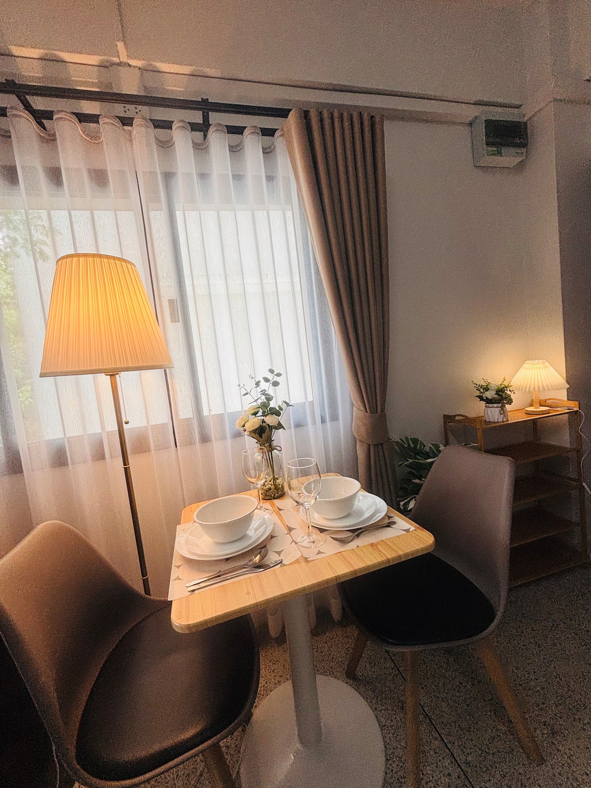 Welcome to The Forest Duplex Retreat – a relaxing nature escape in a quiet green setting. 🍀 The duplex features a bright, high-ceiling living area that feels open and airy. Large glass windows invite natural light and greenery into the space, creating a seamless connection between indoor comfort and outdoor serenity. Imagine wake up to birdsong and soft light filtering through the trees, relax on the soft sofa, work by the window with forest views, or simply enjoy stream your favorite shows.