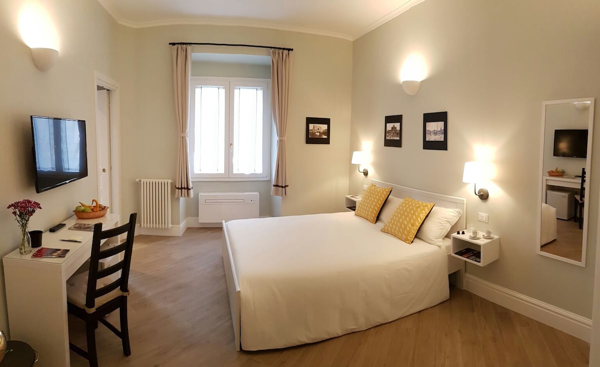 The comfortable large double rooms are equipped with smart TV, WIFI, mini-fridge, desk, hairdryer, air conditioner, courtesy kit of soaps, and wardrobes.