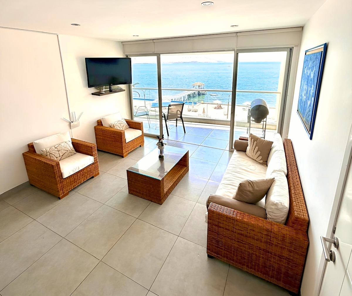 Frente al mar en primera fila insuperables vistas y paisaje en el point de atardecer con las islas ballestas y toda la bahia en frente, playa privada con piscinas y muelle, clubhouse con piscina grande departamento con 3 habitaciones cocina amplia sala comedor terraza con parrilla cuarto principal con Jacuzzi, vista directa al mar todo equipado y amoblado ideal para familias o grupos de amigos hasta 10 personas