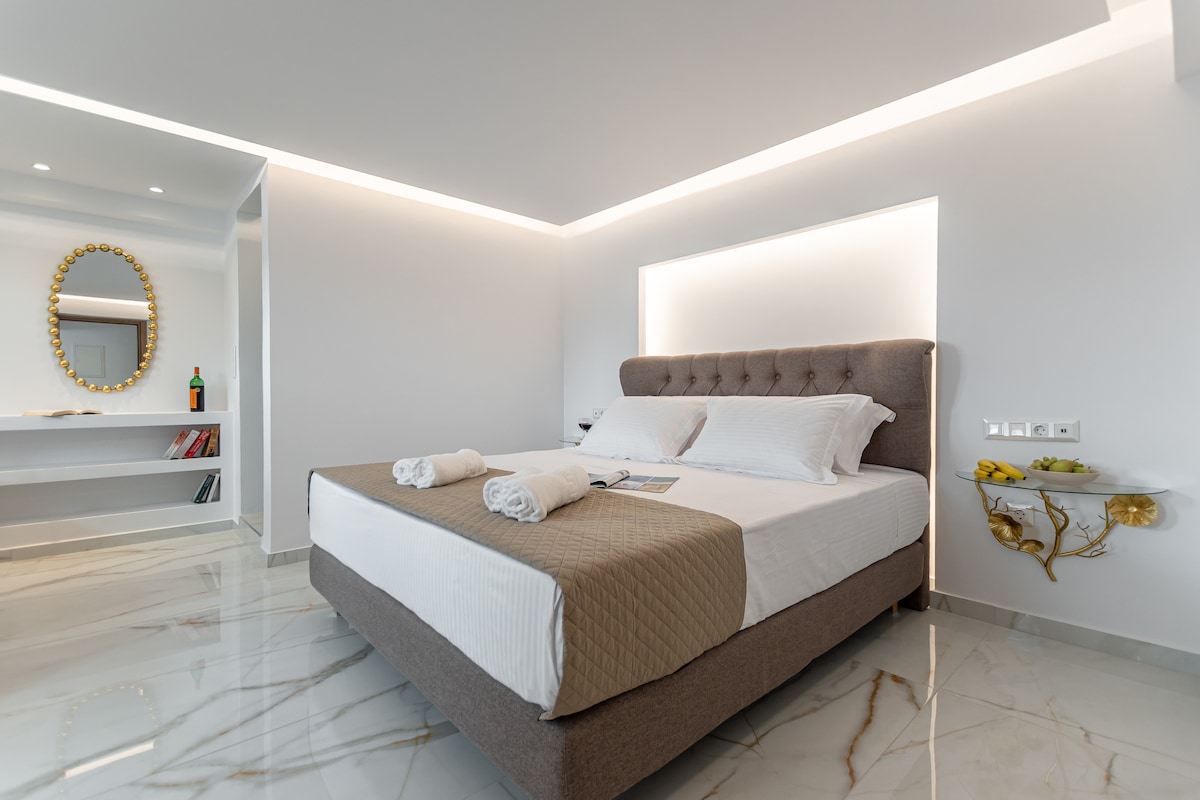 Nested in Naxos Town with stunning views out to the Aegean Sea we offer out guests the opportunity of an exclusive upretentions relaxing experience. Within easy reach from island’s famous PORTARA and Venetian Castle. Our philosophy is to offer first-rate hospitality coupled with unrivaled privacy. Much more than a home our deluxe suite offers supreme comfort combined with elegance style and unique Greek hospitality. it’ s warm minimal lines create a relaxing atmosphere.