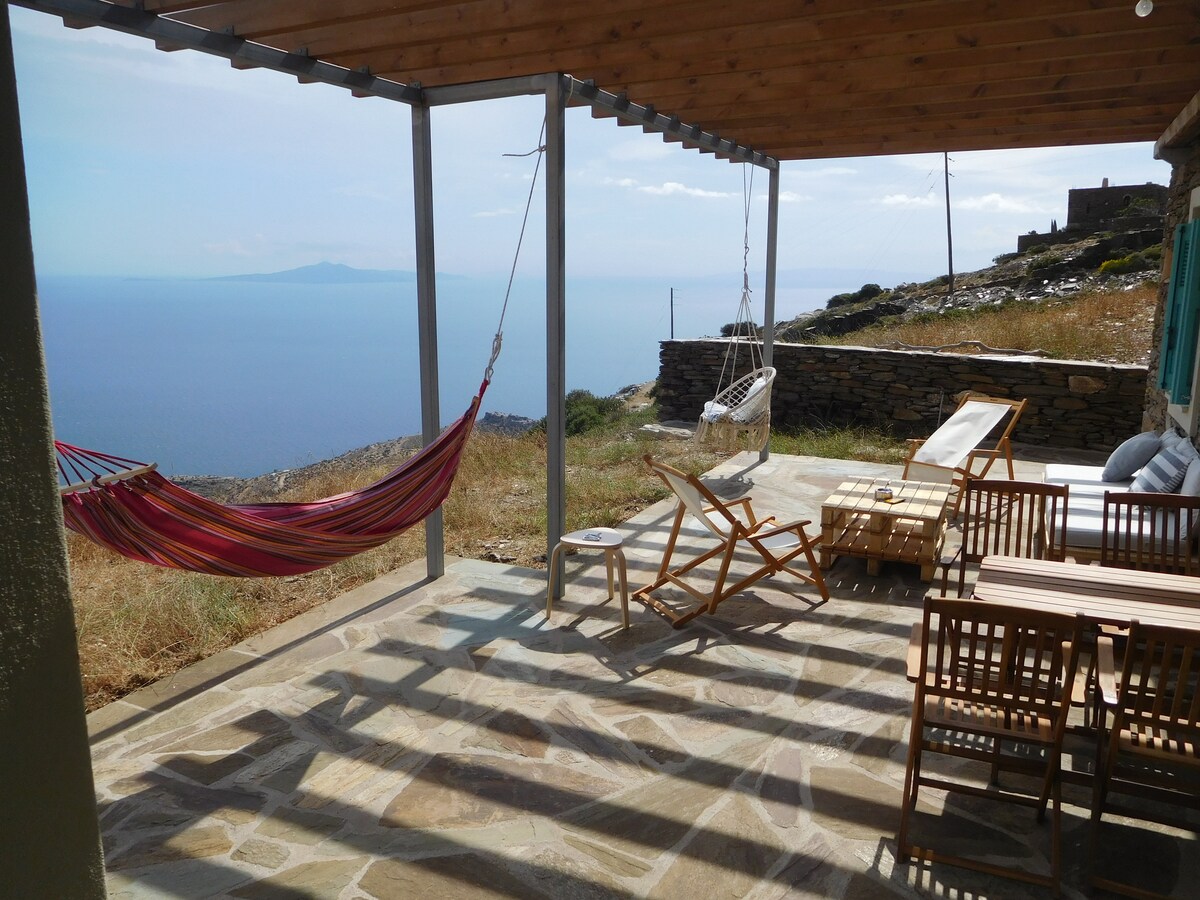 Welcome to our house in Andros. Away from neighbors and noisy areas, in a 2-acre lot, it is ideal for those seeking a peaceful and relaxing vacation. It is roomy and pleasant, with cozy internal and external spaces and breathtaking Aegean views. It is located at the southwestern coast of the island and it is very convenient for exploring it. It is ideal for families and friends seeking escape from the ordinary.
