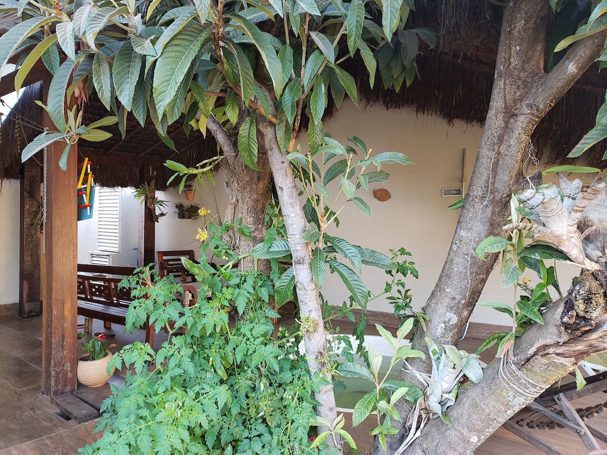 Desfrute do aconchego de uma casa com requinte de pousada , com descontos de 49% para estadia mensal! Dois quartos, 3 banheiros, 2 salas, cozinhas e espaço gourmet, churrasqueira, fogão à lenha e pizza ! Cobertura de piaçava e spa! Espaço verde, pomar, redes para quem relaxar , relaxando e observando a natureza! Ideal para quem gosta de tranquilidade e privacidade!