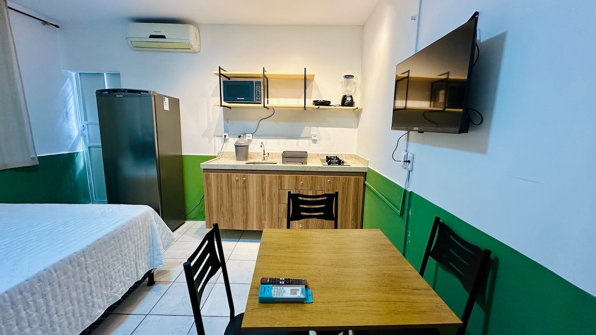 Studio with excellent location, close to pharmacies, Pão de Açúcar, gyms, restaurants, bakery. Air-conditioned Queen Bed 40" Smart TV Wi-Fi Kitchen equipped with 2-burner stove Airfryer Sandwich maker