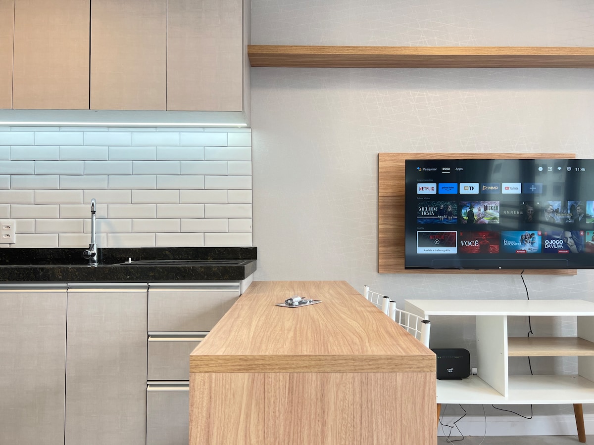 Live a unique experience in this welcoming and stylish studio, designed with an eye for detail to offer comfort, functionality and a lot of style. The planned blue ap is an exclusive differential, with soft lighting and decoration designed to relax, smart and versatile mobile that turns into a dining table or cooking support — perfect for those who value functionality. The Digital Piano is available to relax, practice or be inspired. Smart Tv, Wi-Fi.