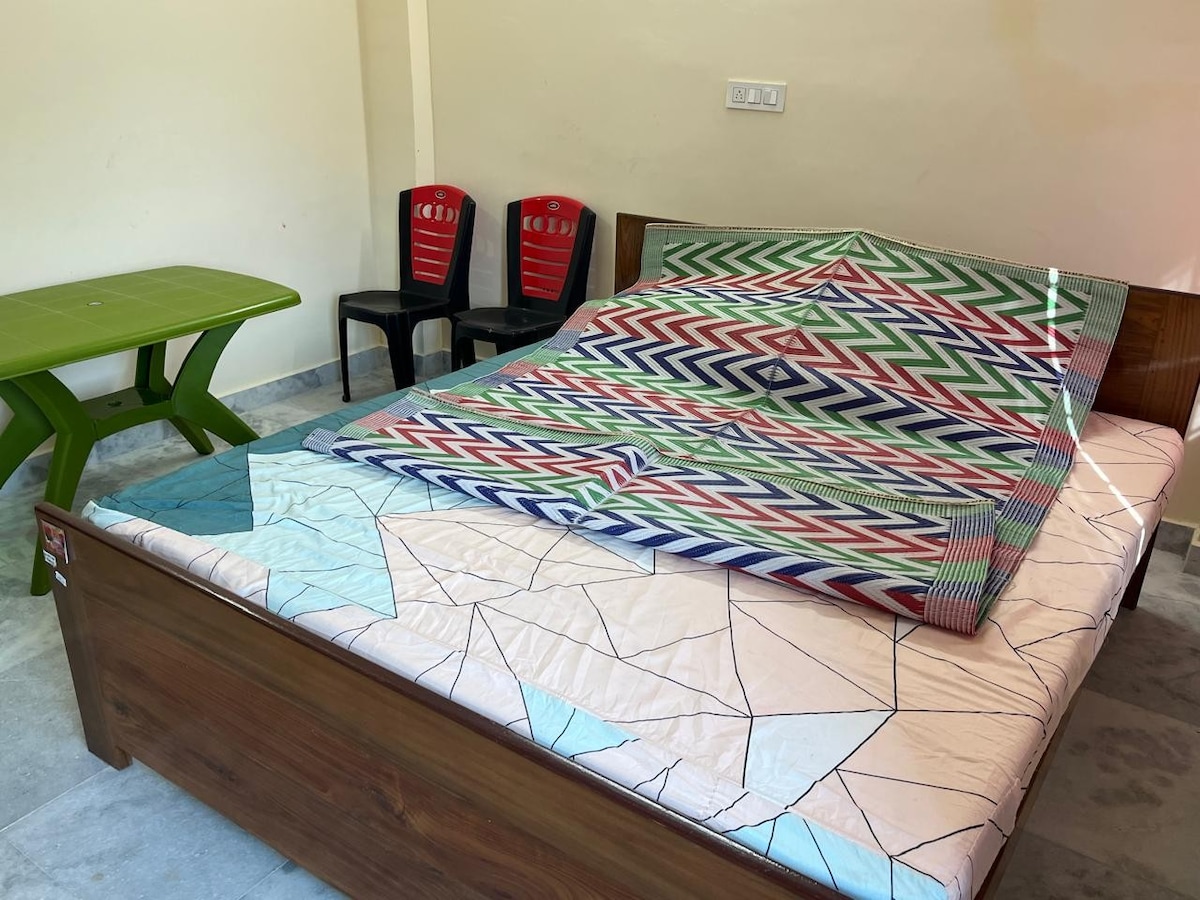 Relax with the whole family at this peaceful place to stay. Spacious room with extra bedding. 5 mins walking distance from TOVP. 2 mins walking from Mayapur Hospital. Please Note: Room is at 3rd floor, many stairs. Lift is not functioning now. Not suitable for elderly people.