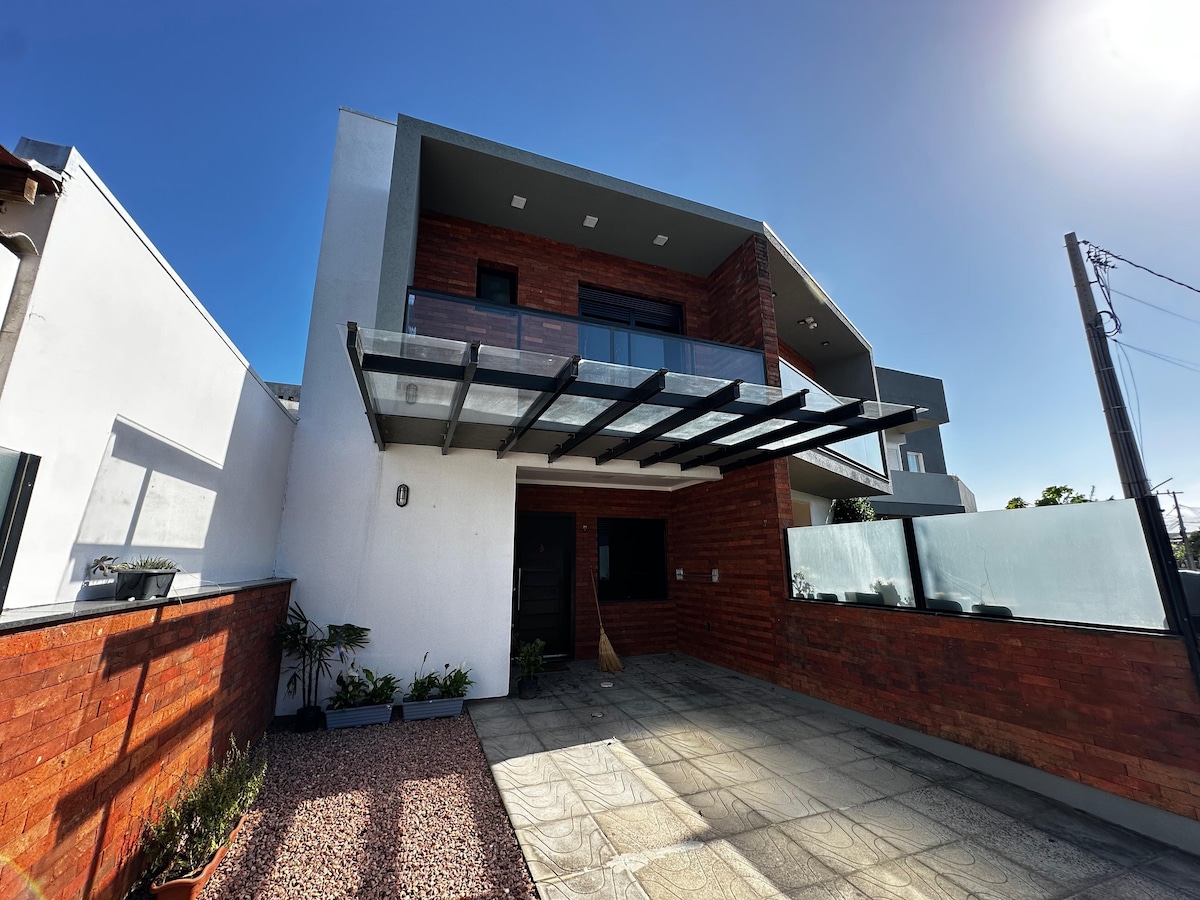 A unique and complete house! With a beautiful patio, swimming pool, living room, 3 bedrooms (with two double beds and one single bed), 1 full bathroom, 1 toilet, full kitchen, a wonderful PIZZA OVEN. Located 2 minutes from Passo de Torres-SC Beach and 3 minutes from Moles Beach in Torres-RS by car.