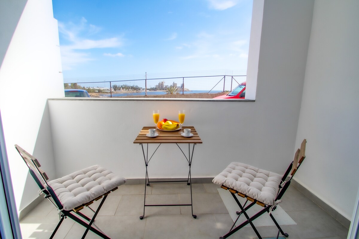 Cosy apartment located on the beachfront. Perfect for quiet vacations. Enjoy the sea view from the balcony and the closeness of the beach. The sand is a few steps from the apartment and the complex has a private access to the beach. The ideal place to escape from the routine and stress, enjoying one of the best sunrises of the island. The apartment is fully equipped so you will have everything you need for your stay. The boho-chic decorated living room has a 65-inch TV and a bed couch. WifiTOP