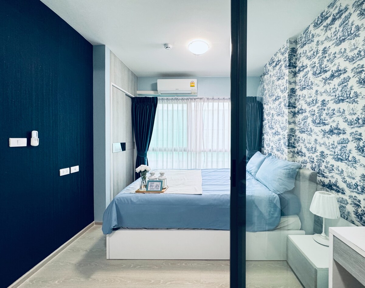 🌿Take a break and unwind at this peaceful oasis. 🌟Good for vacation and work from home. 💢Free Wifi in all area 🏡Private room in low rise condo resort style with pool 29 m, Gym,Jacuzzi, Suana, Co-Working Space, Basketball, Jogging Track and Play ground 🏕Room is for 1-3 person, equip with 1 queen bed, separate living room and kitchen. Wifi, TV, aircon, refrigerator, boiler, full kithenware, working place 🍲 5km to DMK airport and skytrain. A variety local food is all around in local price.