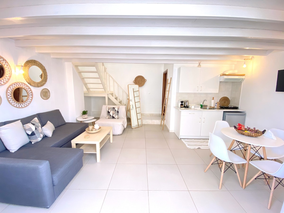 A lovely house in Skala Patmos to the area Chochlakas! The apartment is 300 m away from the center of Skala! It is split-level with a ceiling height of 185 cm on the attic, a separate bedroom on the low-height attic, an open-plan kitchenette with seating area. . Free private parking is available on site. All units are air conditioned and include a seating area. It features a terrace with garden views. An oven and refrigerator are also available, as well as a kettle. Bed linen is provided.