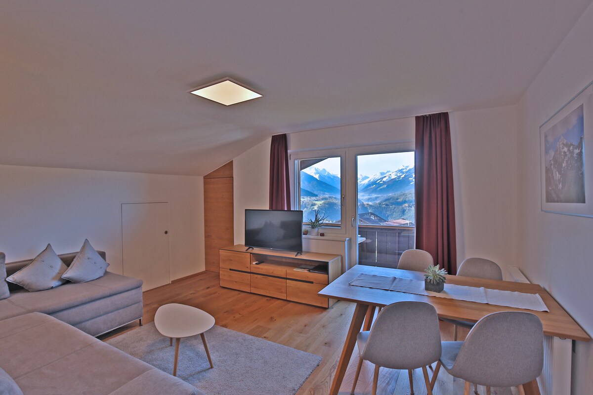 Elegant penthouse apartment in modern alpine style on the Seefelder plateau. The cozy, quiet apartment on the last floor is designed for up to 4 people very comfortably. It has a bright living-dining area with modern fully equipped kitchen, two double bedrooms, two bathrooms, underfloor heating, free Wi-Fi and a very large private terrace. From there you can enjoy the breathtaking view of the mountains and the Inn Valley, both in summer and in winter.