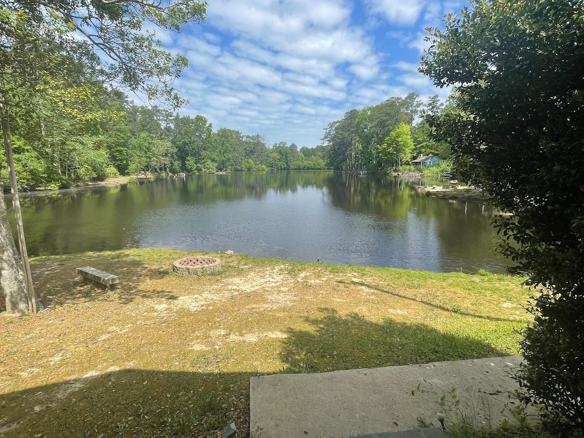 Stay in our Lakeside Bungalow guest house, which has everything you’ll need for a relaxing stay—lake views, king size bed, Smart TV, private patio w/ firepit, & more. Enjoy fishing, paddle boating, & wildlife watching. We often see turtles, deer, great blue herons, geese, frogs, fish, & fireflies⚡️. Guest house shares one wall (kitchen wall) with main house. 2 friendly Pomeranians on site. A secluded nature getaway but still close to all conveniences! 10-15 mins away from Target, Walmart, etc