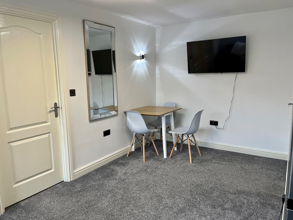A lovely self-contained studio with patio area and free parking. It contains a king bed, chair & work desk; kitchen with fridge, sink, hob and microwave and all necessary crockery and utensils etc; wardrobe, drawers; bathroom with good size shower; wifi TV and USB sockets; its own central heating and hot water systems and modern decor. Towels, tea-towels, soap, washing up liquid and bed linen provided along with some basic food items such as salt/pepper, teabags, coffee, sugar, squash, etc