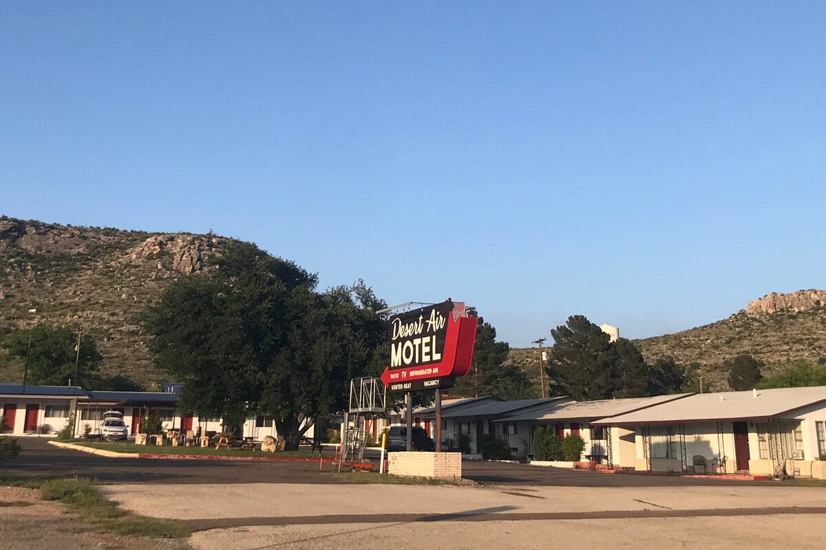 A vintage motel in the west Texas desert with charming rooms and shaded outdoor areas. All of our rooms have been recently renovated. Our exceptionally clean rooms include microwave, refrigerator, antique dresser, towels, and a full bath. We have rooms with 1 Queen Bed (Single) or 2 Queen Beds (Double). If you would like a double, please select 3 or more guests. This will charge an additional $10, which is the upcharge for a double room.
