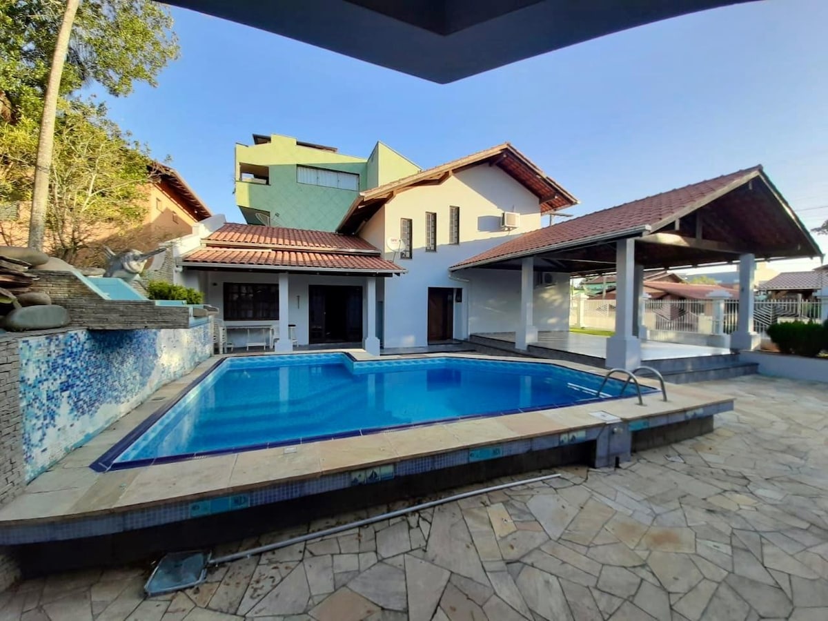 house with 6 en-suites, all en-suites with bed linens, blankets, bath and face towels, with a whirlpool tub, air-conditioning, minibar, TV, Wi-Fi in all rooms, living room with built-in TV, kitchen with refrigerator, microwave, water filter, sandwich maker, coffee maker, blender, air fryer, laundry with washing machine, sink, swimming pool, charcoal barbecue, garage for 4 cars, with a bakery, markets, restaurants, Beto Carrero pizzeria 3 minutes away and the beach near the house
