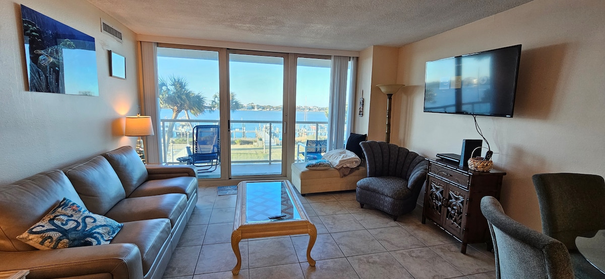 Everything included! Recently remodeled waterfront condo with vaulted ceilings located on Little Sabine Bay and steps from the Gulf of America. Enjoy coffee and cocktails on an amazing balcony overlooking the Bay. Walk or bike to shopping, dining, and the Gulfside. 1 bedroom condo with a loft. The open concept living/kitchen has a 7' island. Beds include King in master, queen in the loft and a queen sofa bed. 1 covered parking spot . 2 bikes 2 Inflatable paddle boards also included.