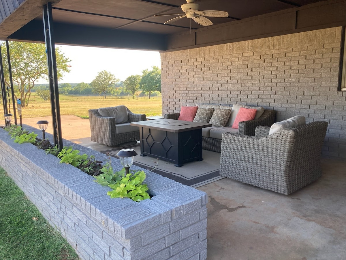 Wi-Fi Pet friendly Close to I-44 between Oklahoma City and Tulsa 3 acre fenced yard Our guests have described our 280 acre farm as: Majestic Breathtaking Immaculate Scenery felt like a movie scene Stunning Sunsets, Sunrises and Stars Gorgeous valley view Country solitude Welcome to a peaceful escape in our beautifully remodeled farmhouse with views of the picturesque mile long valley. Enjoy watching the cattle and donkeys in the pasture and the other wildlife that make their home here.