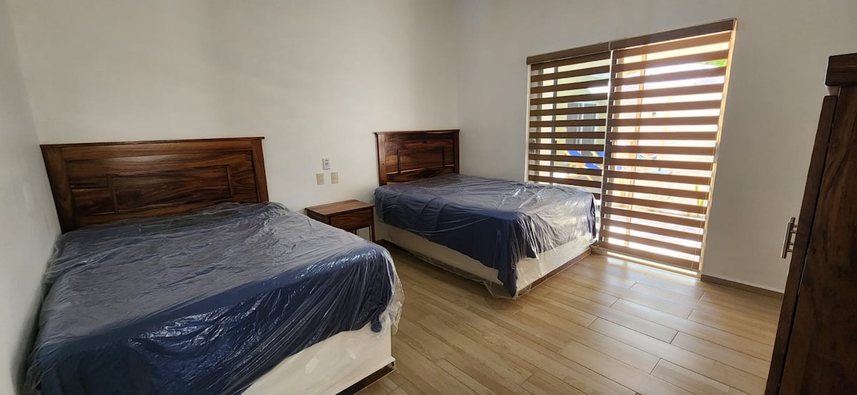 It is located 8 small blocks from the beach, beach and gourmet restaurants, beautiful bay, crocodile farm, visit: Melaque, Cuastecomate, Tenacatita, Barra de Navidad, art galleries, tropical vegetation, walks, bike tours. You'll love it, all the spaces are spacious, dining room, living room, kitchen, bedroom with 2 beds, one queen and one double, with dressing room and bathroom, in the dining room and living room with half bathroom and a sofa bed.