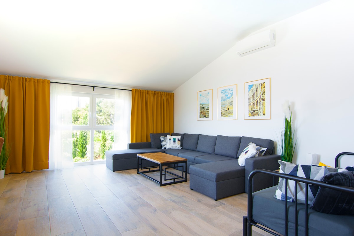 Spacious apartment (100 m2) fully renovated in 2020, only 750m away from the sea, surrounded by the most beautiful beaches in Pula. It includes 3 bedrooms, 2 bathrooms, kitchen dining room, large living room (with extra bed). Shared backyard with two lounge areas, 2 barbecues, swing, and a lawn. In front of the house, on private grounds, there are 2 parking places.