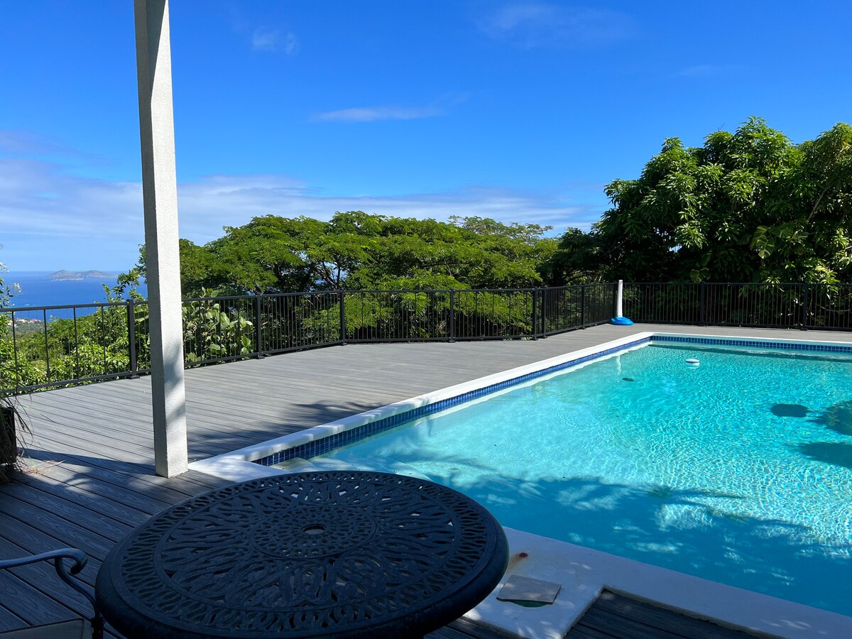 *NO CLEANING FEE* Located on the cool Northside of St. Thomas, our home looks out over a large flat-ish yard & a panoramic view of Magen's Bay, the Atlantic Ocean, and 20 small islands. Your unit has a private entrance 5 steps down from your dedicated parking space. Note: 1. There is no smoking allowed on the deck or in the apartment. 2. Unlike many Airbnbs we do NOT charge a cleaning fee so we ask our guests to sweep and wash their dishes before leaving. 3. No more than 4 guests at ANY time.