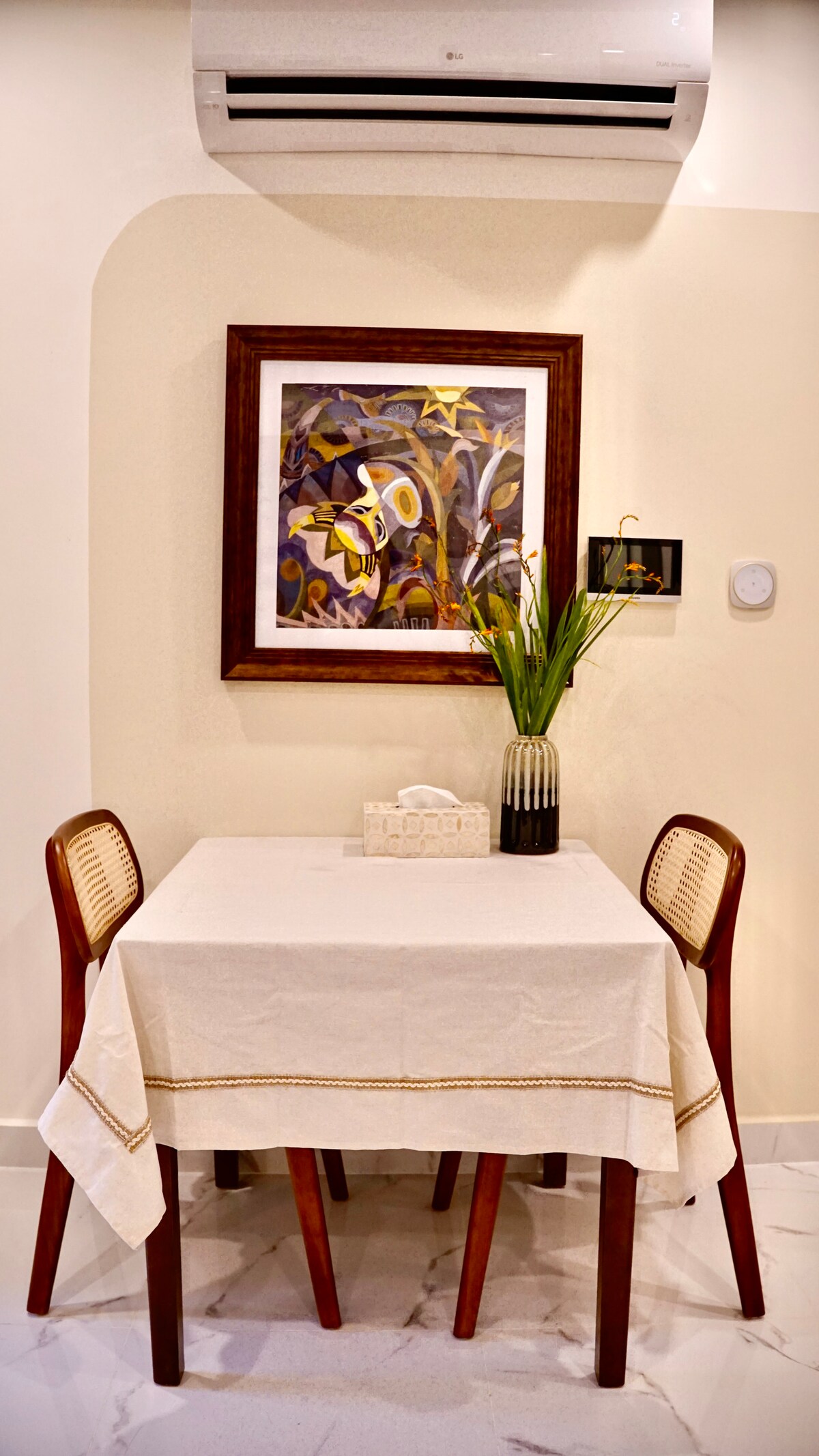 A warm and peaceful apartment where every item is intentionally chosen to create a sense of simplicity and calm. The airy layout overlooks a green park, bringing a natural feeling of balance and relaxation. Surrounded by convenient amenities, it’s an ideal place to unwind.