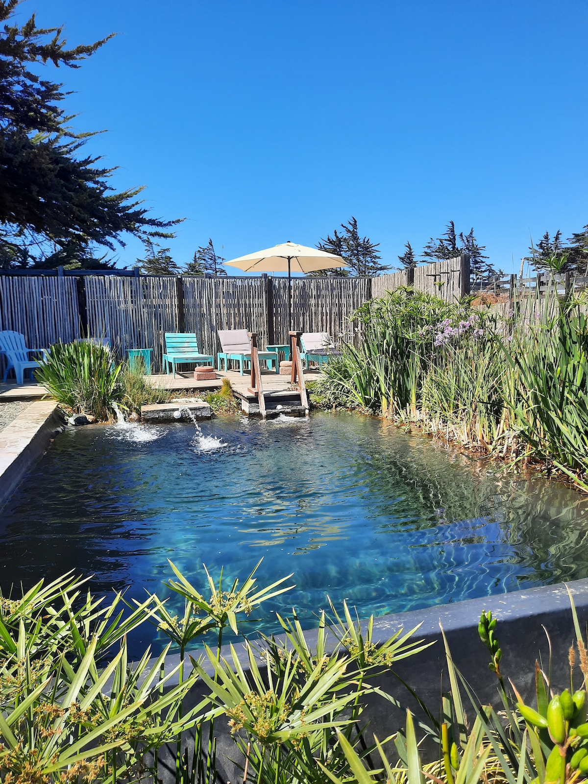 Spectacular family home with a natural pool. Grill area with outdoor dining, stove and pergola. 5 bedrooms (2 en suite), with heating. Living room with a wooded area. Cable TV. Nice view of the ocean and hills of Punta de Lobos. All in a country setting, within a very quiet condominium. A 15-minute walk to the beach and a 5-minute drive. The house has all the amenities for the perfect rest for up to 10 people.